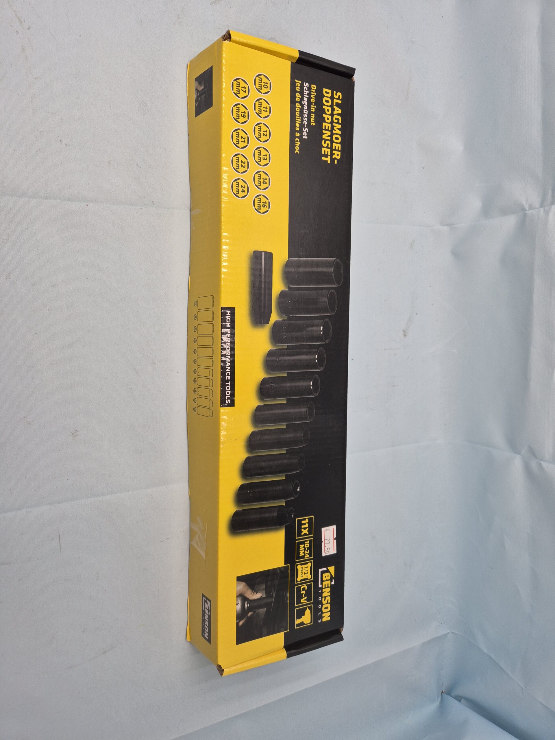 De set bevat doppen in de maten 10mm, 11mm, 12mm, 13mm, 14mm, 16mm, 17mm, 19mm, 21mm, 22mm en 24mm.